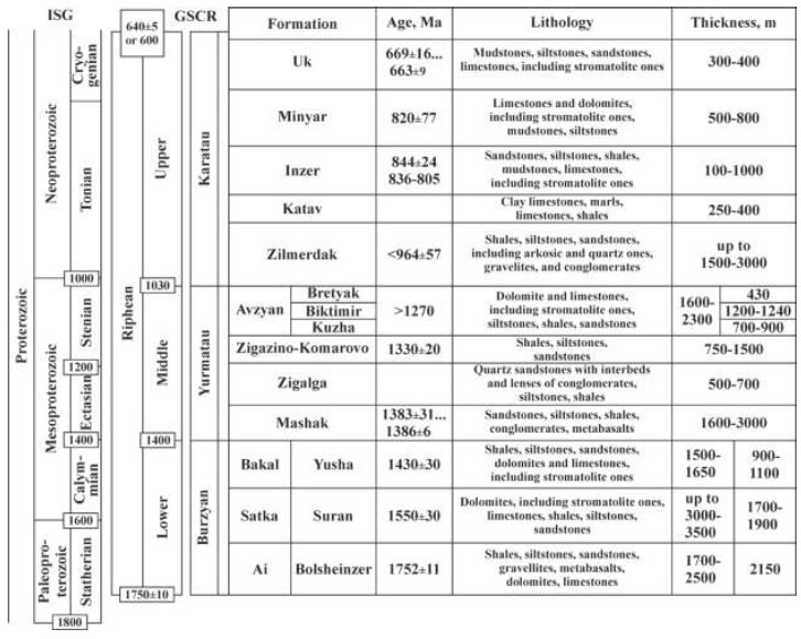 The generalized Proterozoic sequence of the Bashkirian uplift on the western slope of the Southern Urals, according to a previous study [46] (with additions).