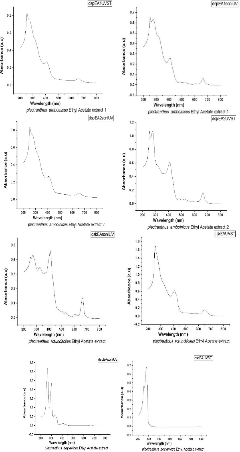 From Table 1 it is observed that the band gap for ethyl acetate extract 1 of PA obtained by sonication and solvothermal processes are the same. This clearly indicates that in both methods, we were able to obtain nano compounds of the same dimension. In the case of second component of the extract of PA, the band gap values are found to be different. A higher value is shown by the solvothermal process, which indicates its efficiency as a better method over sonication.