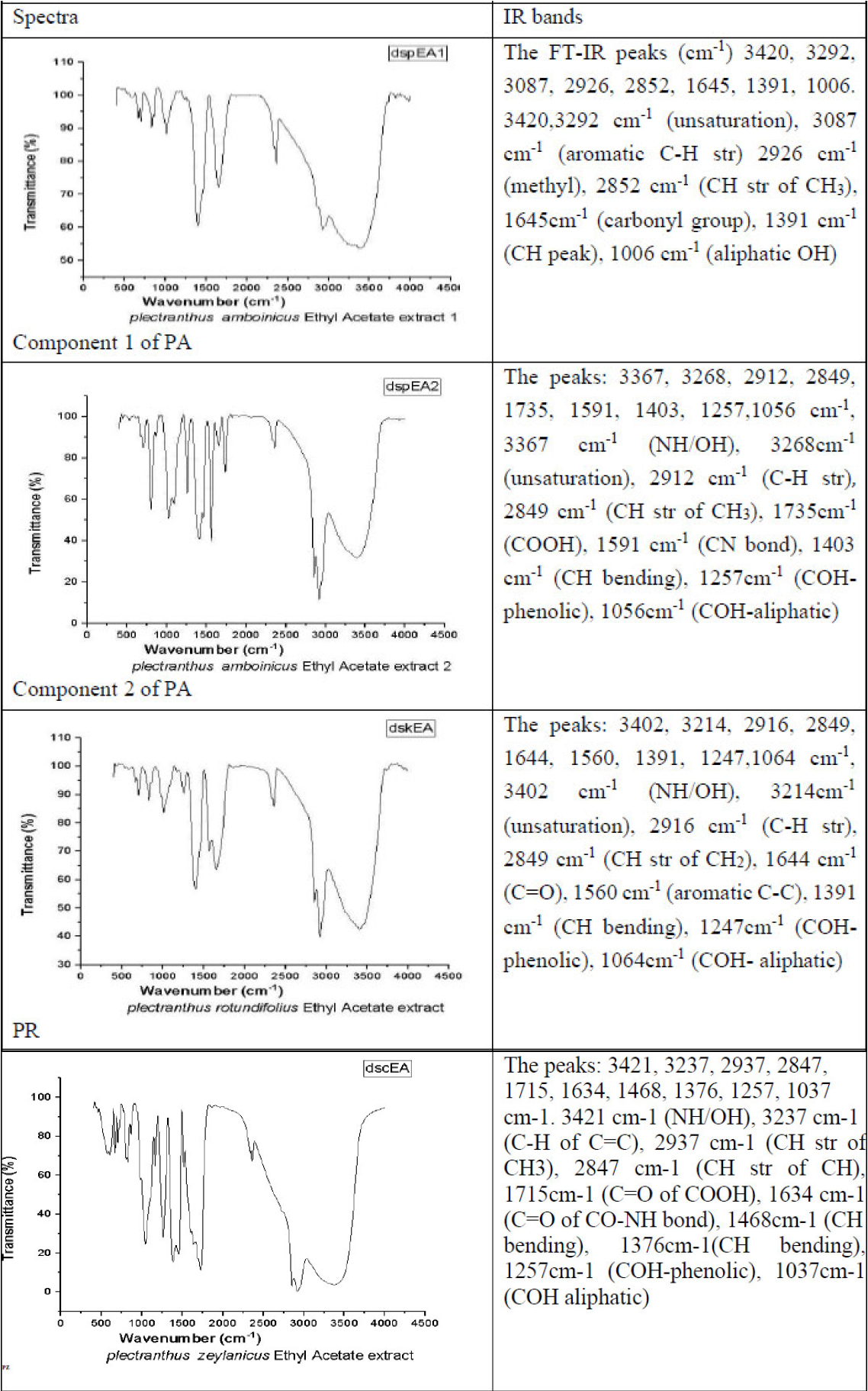 In this communication, we describe the extraction of the Plectranthus genus, namely Coleus amboinicus lour, Coleus rotundifolius lour, and Coleus zeylanicus lour, using ethyl acetate. Coleus amboinicus our. belongs to the Lamiaceae family and has an extraordinary potential to heal various diseases such as fever, allergic reactions, skin allergies, and itching, asthma, cough, cold, rheumatism, arthritis, dysentery, diarrhea, bloating, indigestion, constipation, dyspepsia, and epilepsy [1, 25]. Coleus rotundifolius Lour., also known as Chinese potato can be used as an ingredient in many traditional medicines. It has the ability to treat constipation, dysentery, urinary infection, eye disorders, hypertension, menstrual cramps, diabetes, diarrhea, nausea, throat and mouth infection, cancer, etc., and various skin diseases like eczema, acne, diabetes, burns, abdominal pain, sores, insect bites, allergies, and wounds [26, 27]. Coleus zeylanicus lour is an aromatic herb widely used as a folk medicine in Sri Lanka and India. The plant as a whole or as various extracts is used for the therapeutic applications of ulcers, asthma, cold, dysentery, diarrhea, small pox, eye diseases, dermatitis, throat infection, cough, fever, and atherosclerosis [28]. Plectranthus plant extracts are not is only used in medicine, but also has wide applications in engineering, especially in materials science and nanotechnology [29]. These observations encouraged us to utilize these three plants for our phytochemical studies.