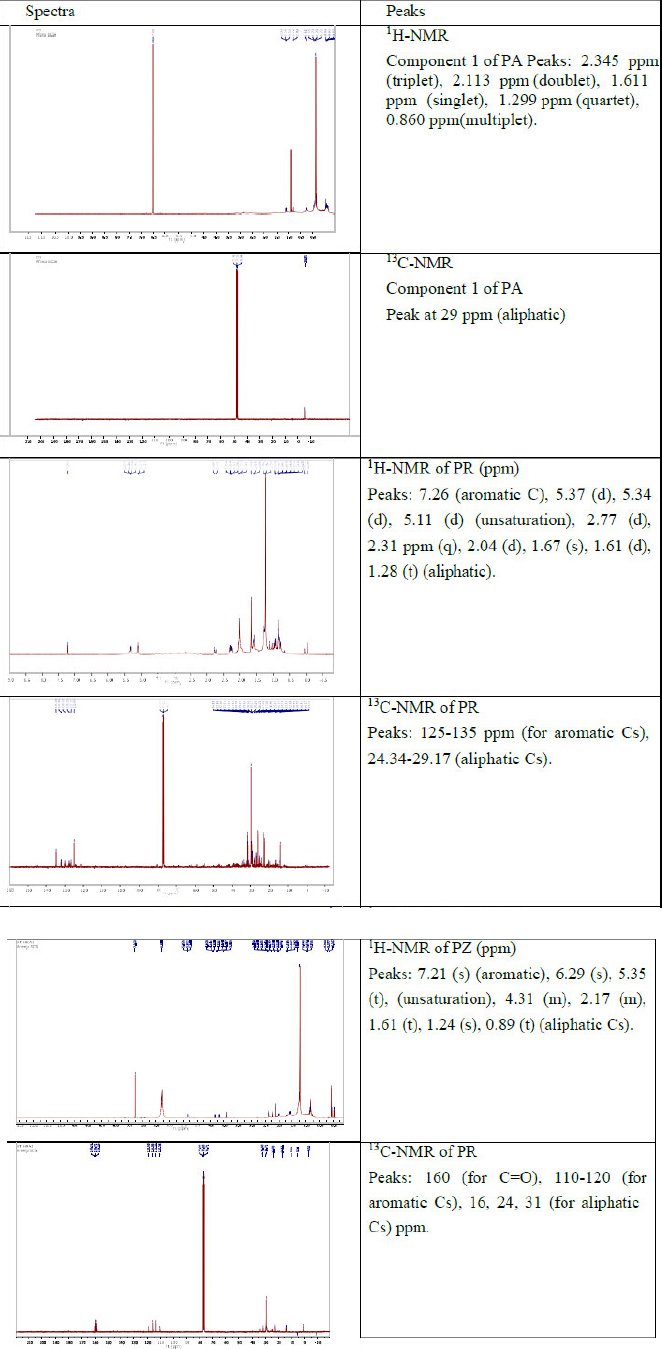 Figure 4 shows 1H and 13C NMR spectra of compounds obtained from ethyl acetate extracts of PA, PR and PZ.