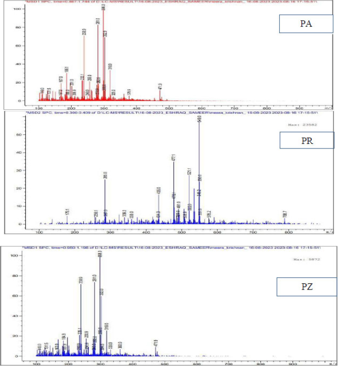 LC-MS graphs of the 2nd component of the ethyl acetate extract of all the three compounds. The maximum molar weight obtained is 471, 549 and 471 for PA, PR and PZ. The most abundant peaks observed for the above are at 298, 549, and 298.