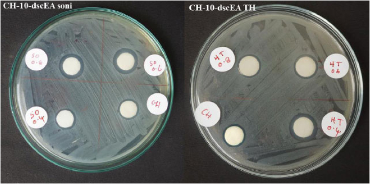 Plants in the Plectranthus family are well known for their antimicrobial actions. Keeping This in mind, the ethyl acetate extracts of PR, PA, and PZ, along with their nanoforms produced via sonication and solvothermal process were tested for their inhibition towards the E.coli growth. Generally, a gram-negative pathogenic bacterium found in contaminated food and water causes food-borne illnesses. (Fig. 7) and Table 2 revealed that the crude extract of PR (2-dskEA) and the upper component of crude extract of PA (3-dspEA1) and their nanoforms (2-dskEA soni and 3-dspEA1 soni) obtained via sonication exhibit moderate antibacterial activity, whereas the nanoform resulting from the solvothermal process exhibited negligible antibacterial effect, indicating its susceptibility to bacterial growth. Though the lower component of crude extract of PA (4-dspEA2) and the extract of PZ (10-dscEA) were not active against E.coli, their nanoforms (4-dspEA2 TH, 4-dspEA2 soni, 10-dscEA TH, and 10-dscEA soni) have significantly resisted the bacterial growth [29]. Among the samples, 10-dscEA TH and 10-dscEA soni with inhibition zone diameter 13 mm were incorporated with chitosan to prepare CH-10-dscEA TH and CH-10-dscEA soni. The antibacterial effect of these solutions are studied and the results are shown in Fig. (8) with corresponding inhibition zone diameter in Table 3. Chitosan, a deacetylated derivative of chitin, is a cationic linear polysaccharide consisting of D-glucosamine and N-Acetyl-D-glucosamine units. Researchers have immense interest in these materials impregnated on chitosan due to its biodegradability, biocompatibility and eco-friendliness with non-toxicity and antibacterial efficiency [30]. Bare chitosan shows an inhibition zone of 12 mm diameter against E.coli as a result of its easy entry into the microbial cell, followed by the destruction of the metabolic activity. Well defined clear inhibition circle compared to that of CH only (control) depicts its improved potential for antibacterial activity after the impregnation of 10-dscEA TH and 10-dscEA soni. This is the result of the synergetic effect of CH and the nanoforms due to the electrostatic interaction between the negatively charged bacterial membrane and the positively charged entities in the sample solution, which in turn disturbs the bacterial action and hence significantly reduces its growth.