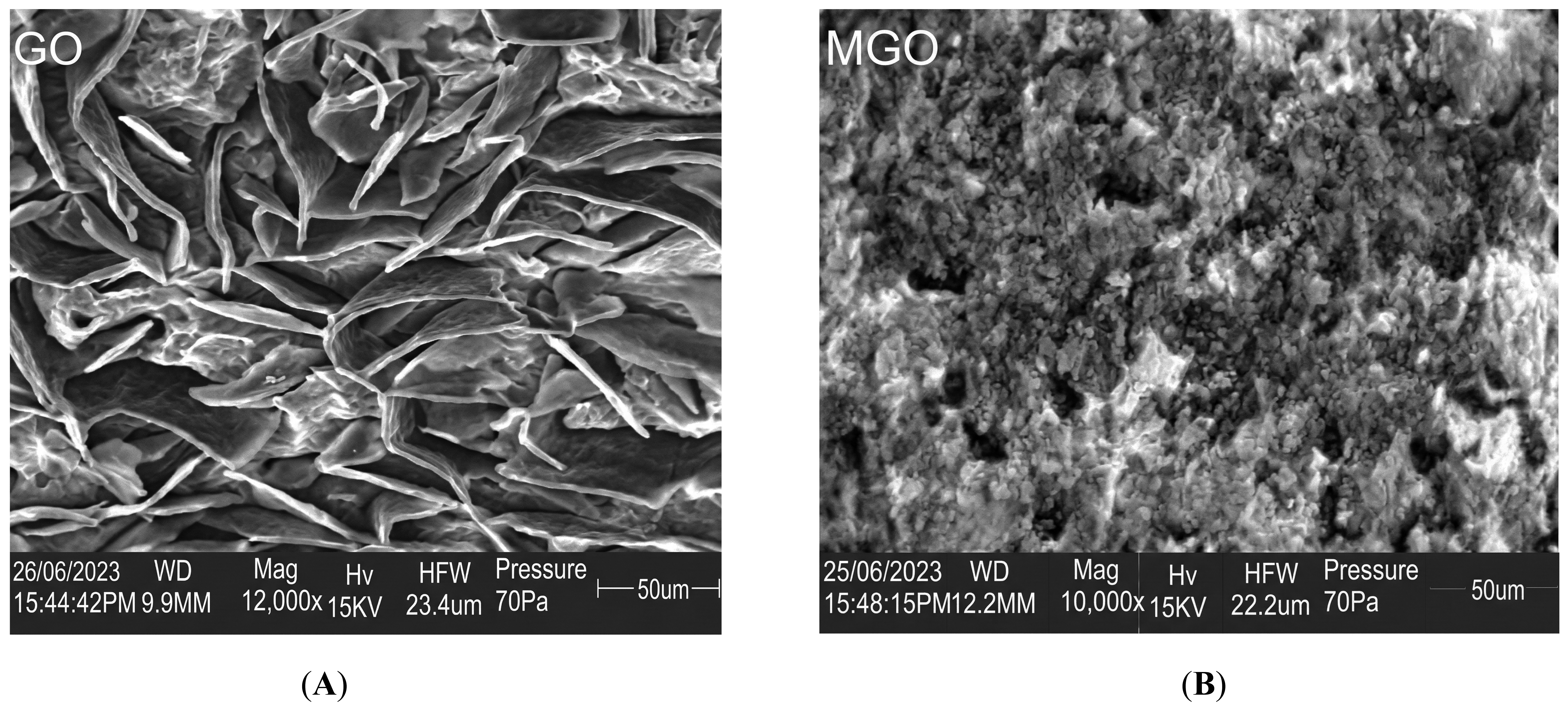 SEM characterization of (A) graphene oxide (GO) and (B) magnetic graphene oxide (MGO).