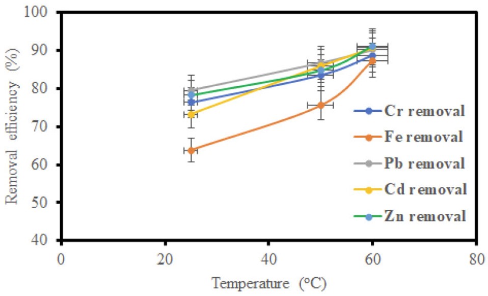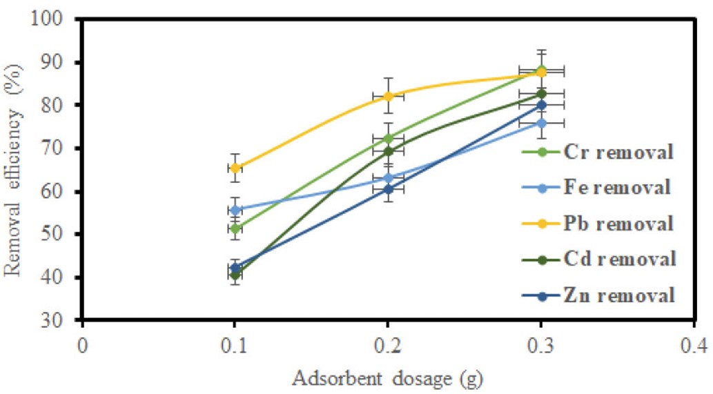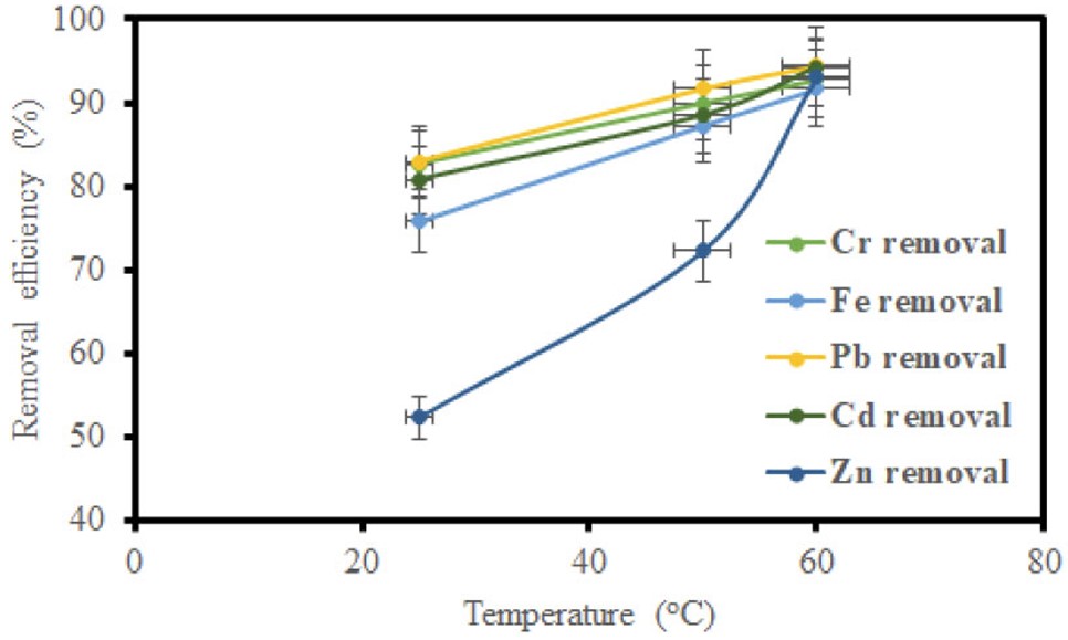 Batch adsorption experiments were carried out with a hot plate stirrer at a speed of 180 rpm. In these experiments, 500 mL Pyrex beakers containing 50 mL of wastewater were utilized. A total of 0.03 g of graphene oxide (GO) adsorbent was added to the wastewater. The mixture was stirred continuously at 180 rpm at a constant temperature of 25°C for 24 h. Following this, samples were collected at intervals of 10, 30, and 60 min to study the effect of contact time at room temperature (25°C). Different adsorbent doses were applied (0.02 g, 0.03 g, 0.05 g) to observe their effect on heavy metal removal. The different doses were added to 50 mL of real wastewater. The effect of temperature was studied at 25°C, 50°C, and 60°C, with 0.03 g of GO being added to 50 mL of real wastewater. The same experimental conditions were followed for MGO. Each parameter was studied to observe its influence on the adsorption efficiency of both GO and MGO. GO was filtered from the effluent using a Whatman filter paper of 150 mm diameter. Before and after the adsorption process, the concentration of heavy metals in the effluent was analyzed using the Perkin Elmer atomic absorption spectrophotometer (Analyzer 400 AA).