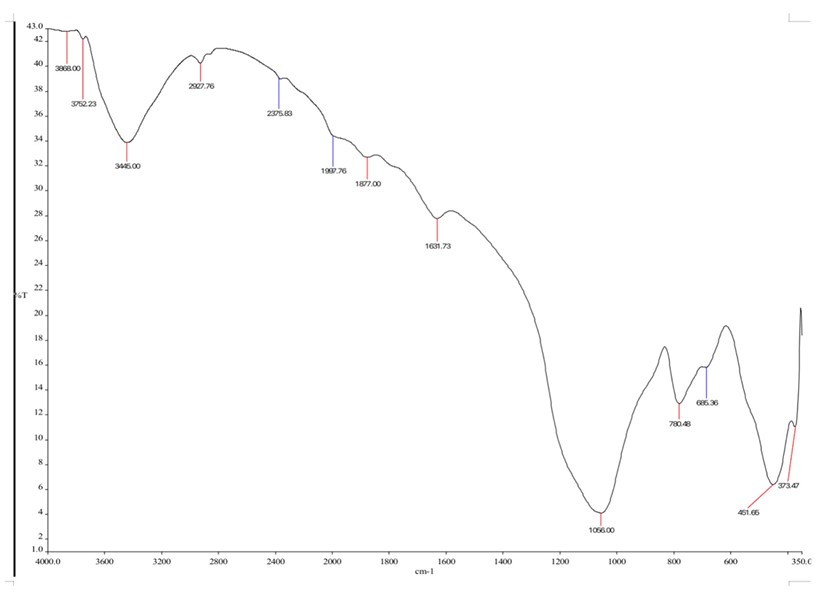 The FTIR analysis was performed to identify the functional groups present in GO and MGO. The FTIR spectra for GO, which are illustrated in the figure (Fig. 1) and summarized in the table (Table 3), show a strong absorption peak at 3480 cm-1 due to O-H bending vibrations. This absorption peak at 1635 cm-1 can be labelled for the C=C stretches of the aromatic groups, whereas the peak at 1007 cm-1 is assigned to C-O stretches due to the alkoxy groups. The FTIR results corroborated previous research [1], indicating that GO nanosheets carried various oxygen-containing groups. These oxygen groups on the surface of GO serve as binding sites for metal ions in the adsorption process, confirming the formation of graphene oxide (GO). The FTIR spectra for MGO are shown in Table 3 and Fig. (2). The GO peaks persisted in the MGO spectra but with significantly reduced intensities following the chemical deposition of iron ions onto the GO sheets. In the MGO spectra, the O-H stretching vibrations appeared less intense and were first observed at 3445 cm-1. The peaks at 1877 cm-1 were associated with C=O stretching of carboxyl groups, and the peak at 1056 cm-1 was linked to C-O stretching vibrations of the epoxy group. A distinct and sharp peak at 685 cm-1 in the MGO spectrum, corresponding to Fe-O stretching vibrations, confirmed the presence of iron particles on the GO surface, corroborating findings from a previous study [1, 37].