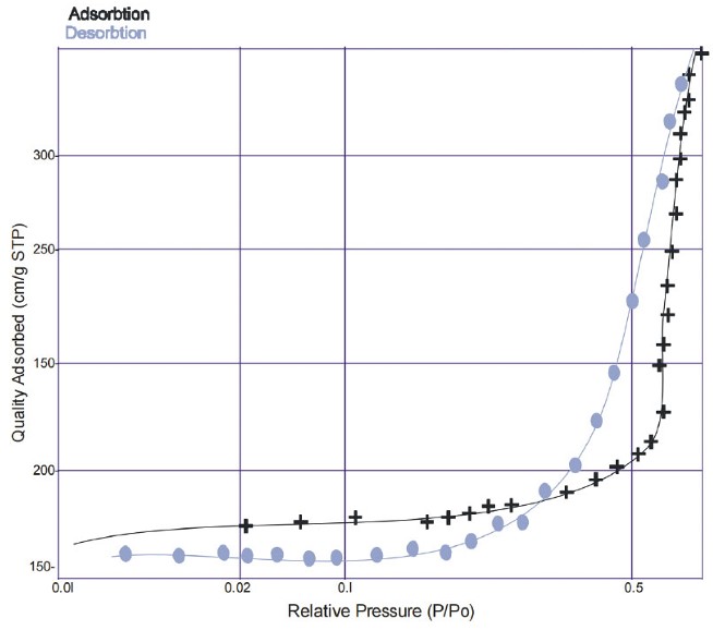 The textural characteristics of the synthesized GO and MGO were evaluated using nitrogen adsorption-desorption measurements through the BET method. Table 4 presents the pore sizes, specific surface areas, and pore diameters of GO and MGO. The adsorbents exhibited remarkably high specific surface areas according to BET measurements. GO and MGO have BET surface areas of 1260.35 m2/g and 1165.22 m2/g. With pore sizes of 0.452 and a pore diameter of 2.825 nm, GO and MGO showed mesoporous properties that agree with published research [47]. Figures 3 and 4 show the nitrogen adsorption-desorption isotherm for GO and MGO.