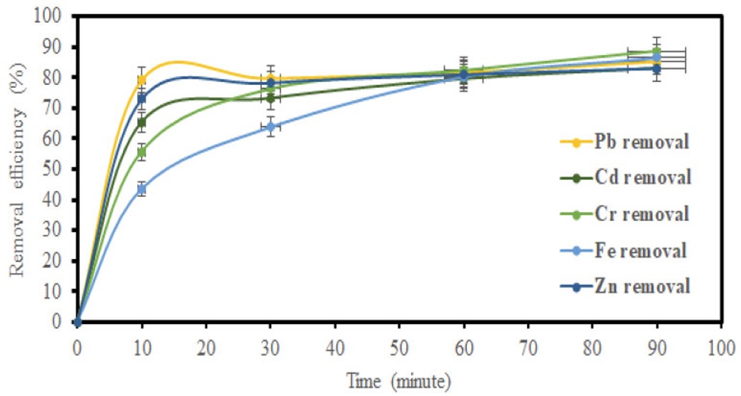 The influence of contact time was evaluated by varying the contact time intervals at 10, 30, 60, and 90 minutes while maintaining constant temperature and adsorbent dosage. The effect of contact time on the heavy metal ion adsorption performance for GO and MGO is shown in (Figs. 5 and 6). The adsorption increased with an increase in contact time, which is due to a longer interaction between the metal ions.