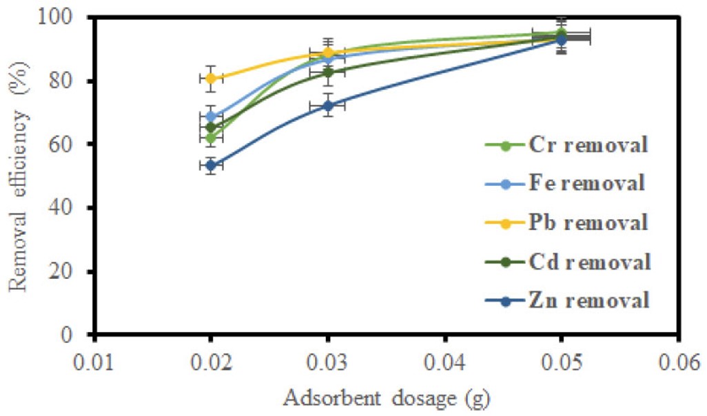 Chromium, iron, lead, cadmium, and zinc adsorption was done in a batch process using GO and MGO while varying the contact time, temperature, and adsorbent dosage to evaluate adsorption efficiencies. Based on the results obtained, the adsorption process was observed to greatly favour the removal of the heavy metal ions.