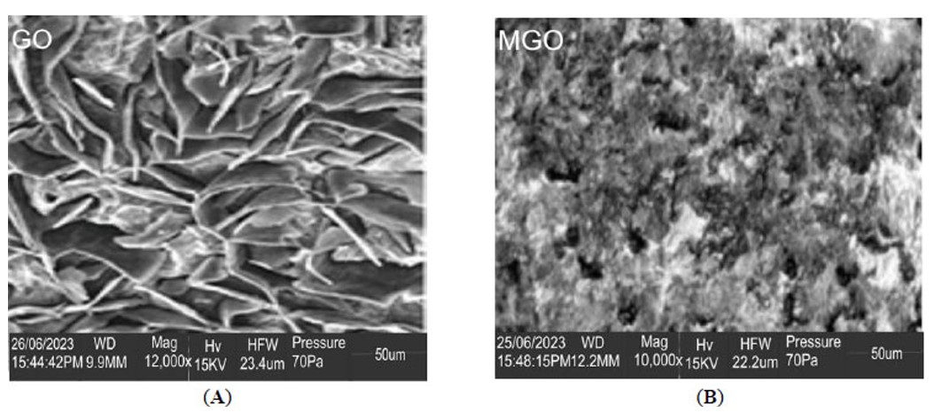 SEM characterization of (A) graphene oxide (GO) and (B) magnetic graphene oxide (MGO).