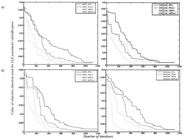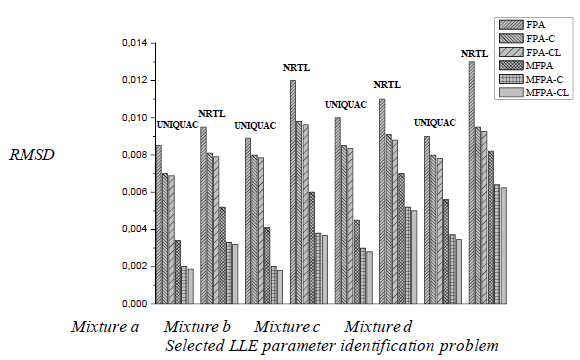 The performances of FPA and MFPA were quantified and compared based on two metrics: the RMSD values for both thermodynamic models after the minimization of equation (11) and the number of objective function evaluations (NFE) involved in the parameter identification. Four systems were selected as benchmarking examples to illustrate the numerical performance of FPA and MFPA in the parameter estimation for LLE modeling. These mixtures correspond to the predictions of LLE for the ternary and quaternary mixtures: a) water + levulinic acid + dimethyl succinateat 298.15K, b) water + levulinic acid + glutarateat 298.15K, c) palm oil + palmitic acid + ethanol + water at 318.2 K and d) limonene + carvone + ethanol + water at 298.2 K. The parameter identification for these LLE mixtures has been solved using FPA and MFPA with four different operating scenarios. These scenarios corresponded to the use of both FPA and MFPA with and without the application of closure equations and local optimization. This approach has been used in a previous study [9] and it has been applied in this article for comparison purposes with other metaheuristics. The nomenclature used for results reported in this section is: FPA-C and MFPA-C for flower pollination algorithms with closure equations; FPA-CL and MPFA-CL for flower pollination algorithms with both closure equation and local optimization, respectively. The function fmincon of MATLAB® was employed as local optimization in these calculations.