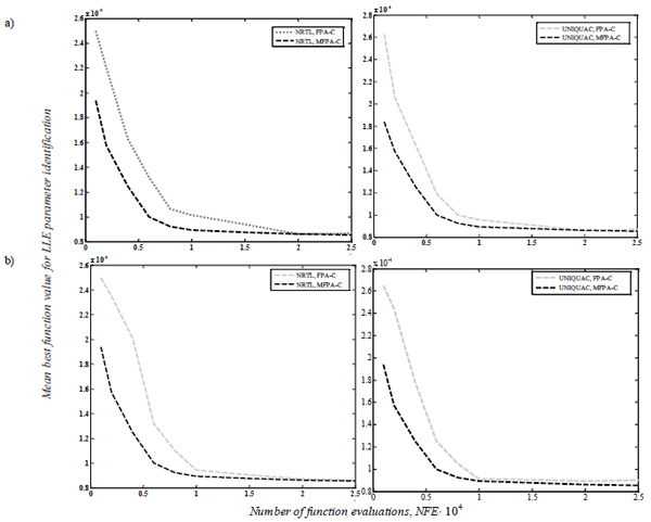 Particularly, MFPA with closure equation is effective for finding the interaction parameters Aij of the NRTL and UNIQUAC models. Note that the application of a scaling factor to control the mutation in the local pollination phase and the additional intensive exploitation phase appear to aid the exploration capabilities for global optimization of MFPA. In terms of the efficacy, MFPA showed the best performance especially at low values of NFE and this numerical trend prevails for both NRTL and UNIQUAC models. Overall, results showed that 600th iterations of MFPA-C are sufficient to find the optimal parametersin these LLE problems, while FPA with and without closure equations required more than 800 iterations for reaching convergence. In both cases, further generations only seem to improve marginally the solution obtained independently of the application of closure equation. However, the use of closure equation for LLE parameter identification helps to reduce significantly the numerical effort during the model parameter identificationwith these stochastic solvers. In particular, the impact of using closure equation on algorithm efficacy and convergence rate is more evident at early stages of parameter identification, see Figs. (1) and (2). This relevant numerical performance has also reportedfor the LLE modeling of other thermodynamic systems using nature-inspired optimizers [9].