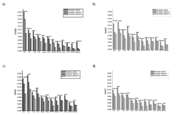 In particular, Fig. (5) shows the RMSD values obtained during the parameter estimation of NRTL and UNIQUAC models for the selected food products systems using all stochastic solvers. It is clear that MFPA outperformed all other algorithms in terms of reliability (i.e., it showed the lowest values of RMSD) with and without the closure equations and local optimization. It is interesting to remark that the use of the local optimization has more impact on the performance ofthe other stochastic methods in comparison to Flower Pollination Algorithms. This result suggests that FPA and MFPA may show better exploration capabilities for finding the optimum parameters Aij.