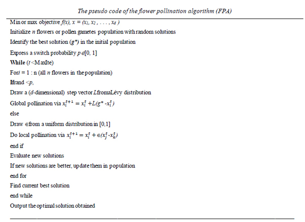 Then, the main steps of FPA, or simply the flower algorithm [21], are illustrated below: