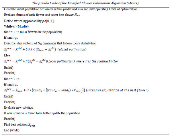On the other hand, the random selection of exploration and exploitation phases, which are based on the selected value of switching probability, sometimes causes the FPA to lose direction and move away from the global best solution.In this paper, an approach is introduced to enhance the performance of FPA specifically for LLE parameter estimation problems. A modification has been applied where i) the local pollination phase is modified by employing a scaling factor F to control the mutation occurring in flowers during pollination and ii) an additional intensive exploitation phase is added to improve the best solution. The details of the Modified Flower Pollination Algorithm (MFPA) are givenin [24]. Therefore, the pseudo-code of the MFPA can be summarized below: